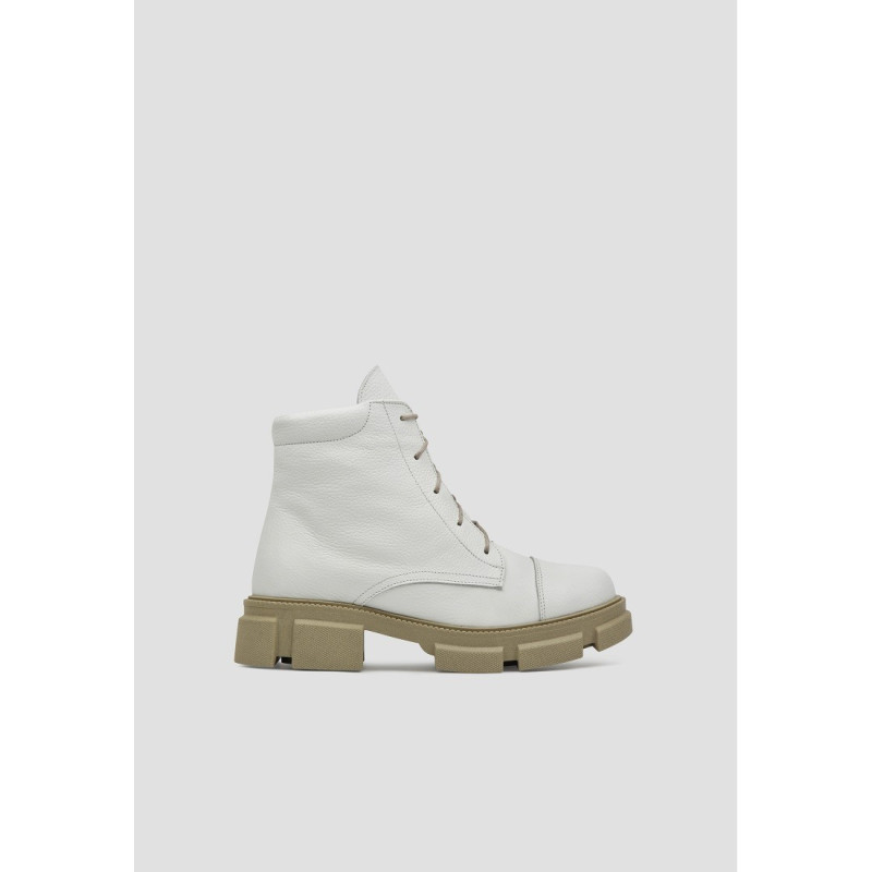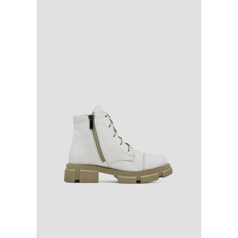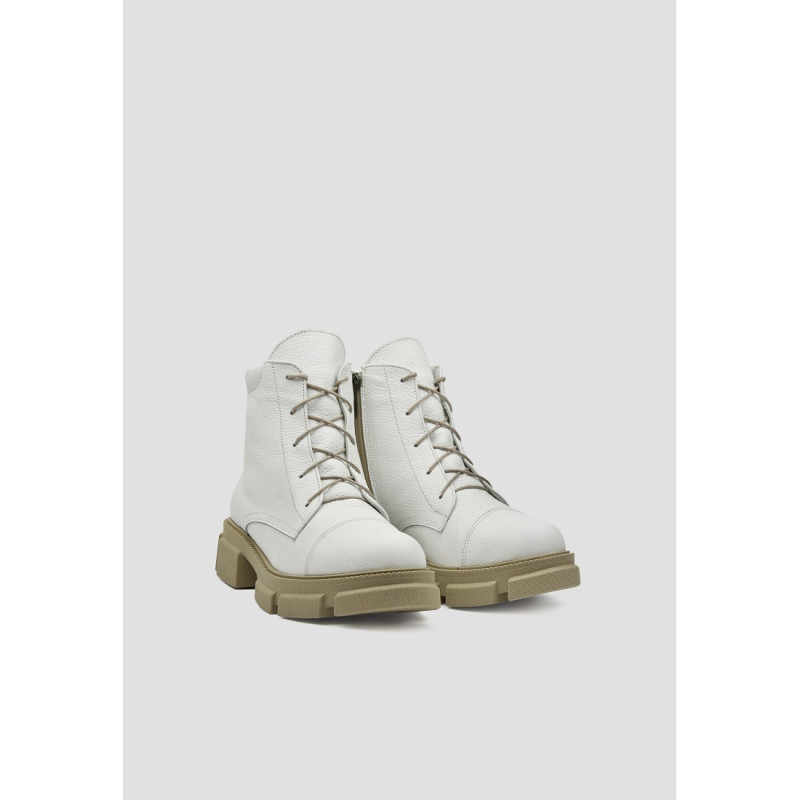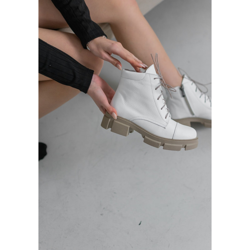 Стильные кожаные ботинки белого цвета отлично дополнят любой образ. Устойчивая нескользящая подошва и строение колодки помогут чувствовать комфорт даже при длительной носке в холодную пору. Внутри утеплитель из байки, который согреет Ваши ножки. В качестве застежки - молния и шнуровка, которая хорошо фиксирует стопу.