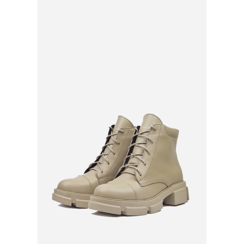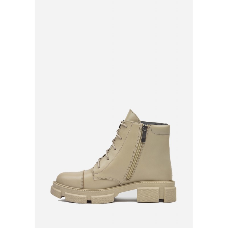 Классические ботинки в благородном бежевом цвете. Изготовлены из натуральной кожи, внутри - байка. Полнота средняя, но благодаря шнуровке можно регулировать полноту. Имеется невысокий каблук квадратной формы. Благодаря молнии, ботинок удобно снимать и одевать, не расшнуровывая.