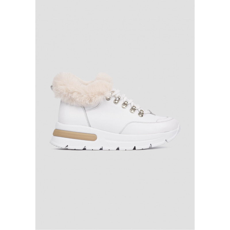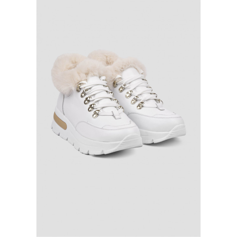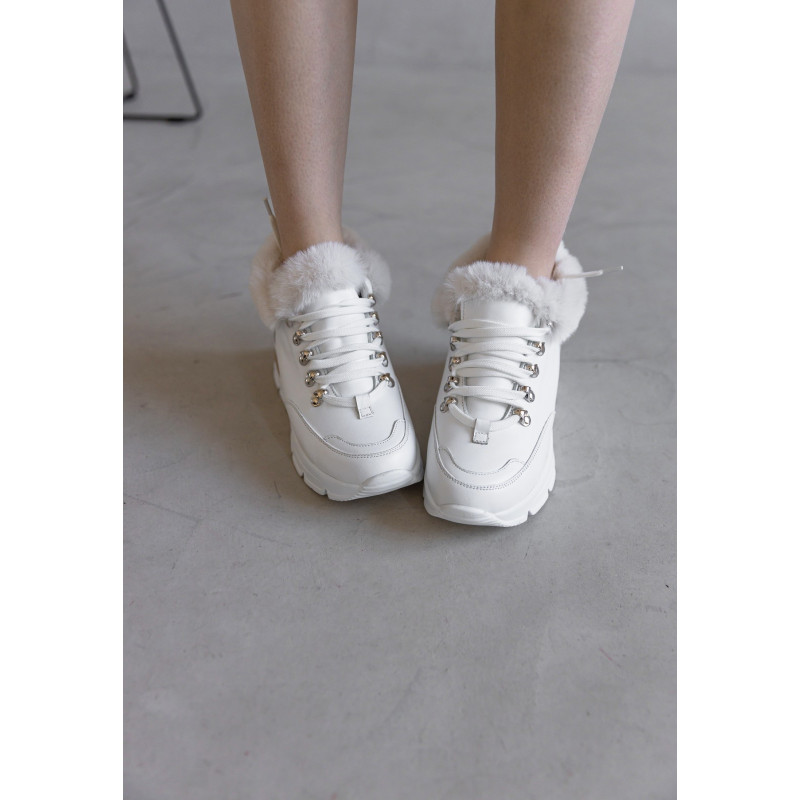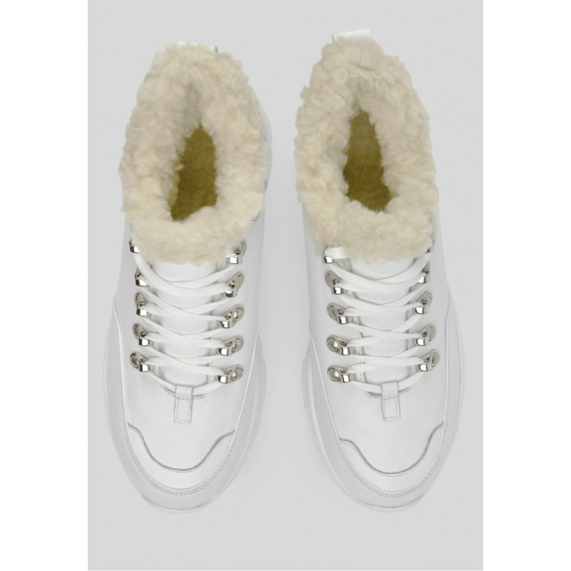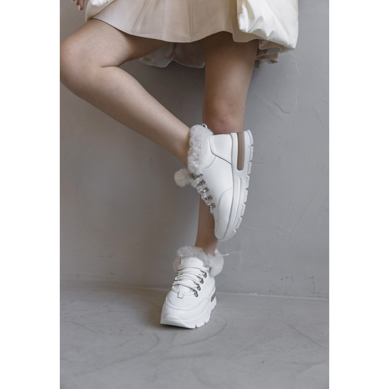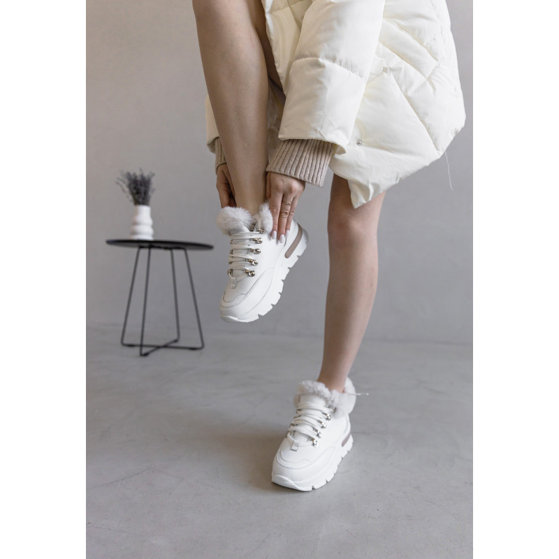 Белоснежные женские зимние кроссовки изготовлены из натуральной кожи, внутри - набивная овчина. Полнота средняя, но благодаря шнуровке можно регулировать ее регулировать. Идеально подойдут к зимнему пейзажу.