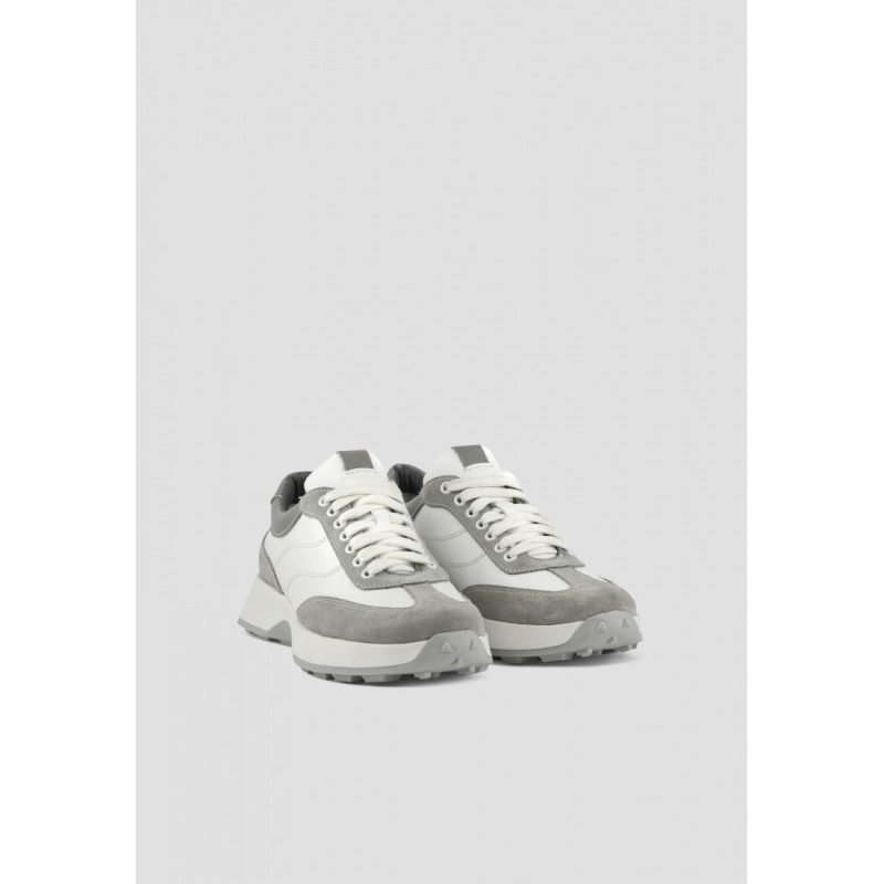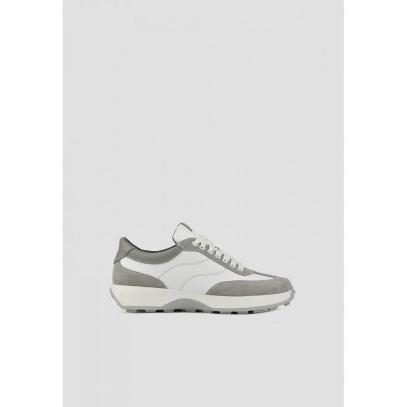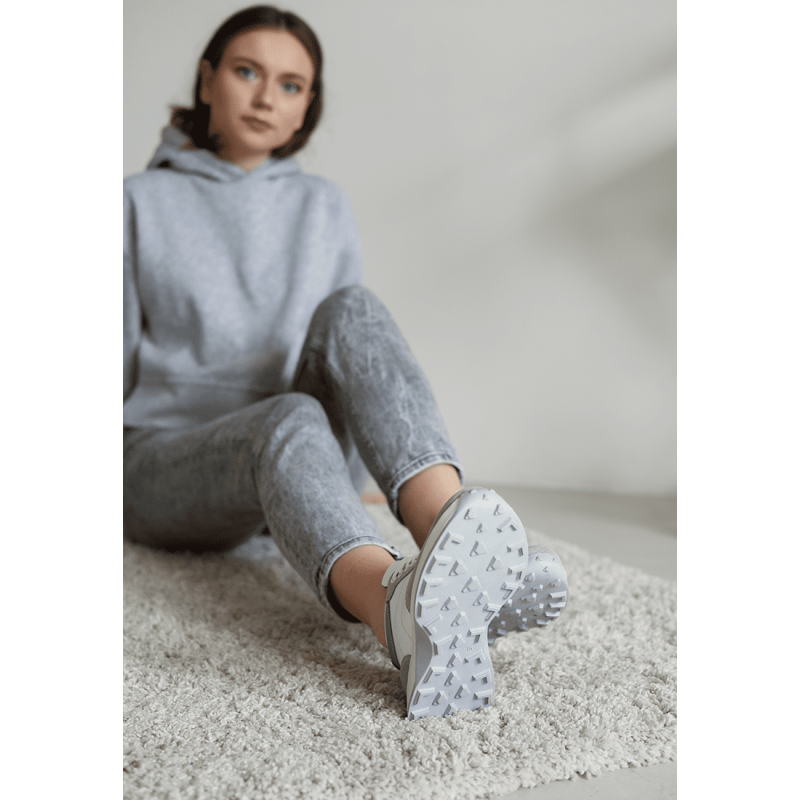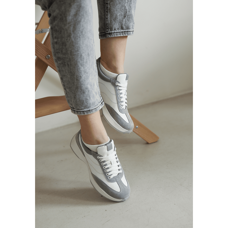 Отличный базовый вариант - короткие женские кроссовки из натуральной белой кожи и замши серого цвета. Удобная полномерная колодка, хорошо подходит для ножек средней полноты. Внутри мягкая кожаная стелька для большего комфорта. Подошва - не скользит.